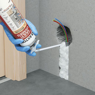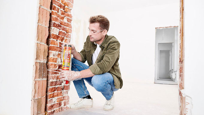 • Rellenar y sellar. Su capacidad de expansión le permite sellar huecos, fisuras, juntas irregulares o grandes grietas con facilidad, sellar aislamientos o rellenar las cavidades que se forman alrededor de las tuberías, los cables, paredes, techos, suelos, etc. Y todo eso en diferentes tipos de superficies como hormigón, piedra, madera, ladrillo... Además, la colocación de esta espuma ayuda a evitar filtraciones de aire, agua, polvo e insectos.
